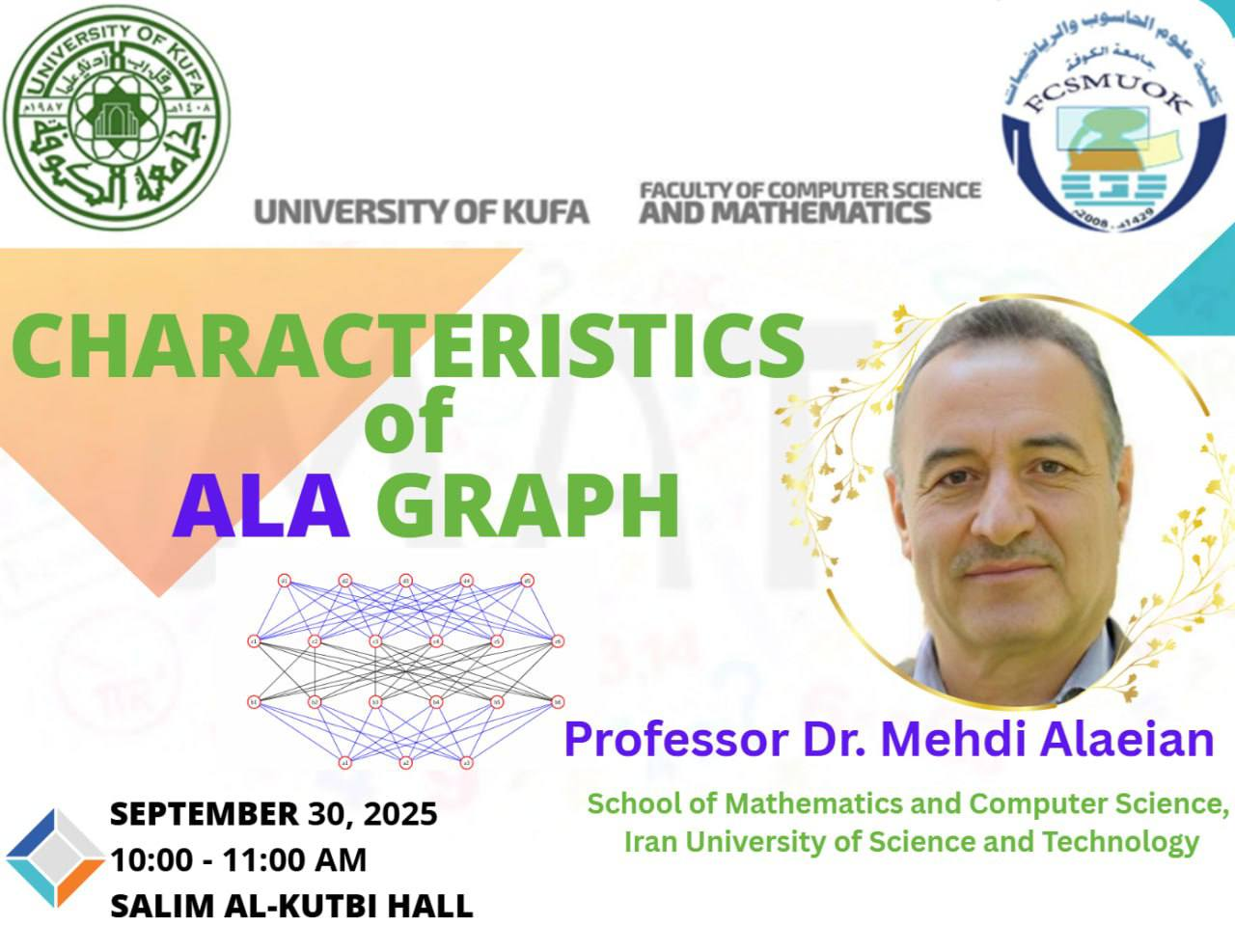 دانشکده علوم ریاضی و کامپیوتر دانشگاه کوفه، روز سهشنبه ۸ مهر ۱۴۰۴، سخنرانی علمی با عنوان «ویژگیهای گراف ALA» برگزار کرد.